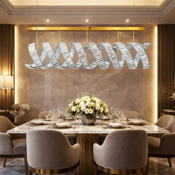 Ấn tượng đầu tiên của mẫu đèn hiện đại này nằm ở kiểu dáng độc đáo với phần thân đèn được tạo hình uốn lượn mềm mại như một dải ruy băng ánh sáng. Thiết kế phá cách nhưng vẫn giữ được sự cân đối giúp đèn trở thành một điểm nhấn nghệ thuật nổi bật trong không gian nội thất. Khi treo phía trên bàn ăn, đường cong uyển chuyển của đèn tạo cảm giác chuyển động nhẹ nhàng, mang đến vẻ đẹp hiện đại và đầy tính thẩm mỹ.